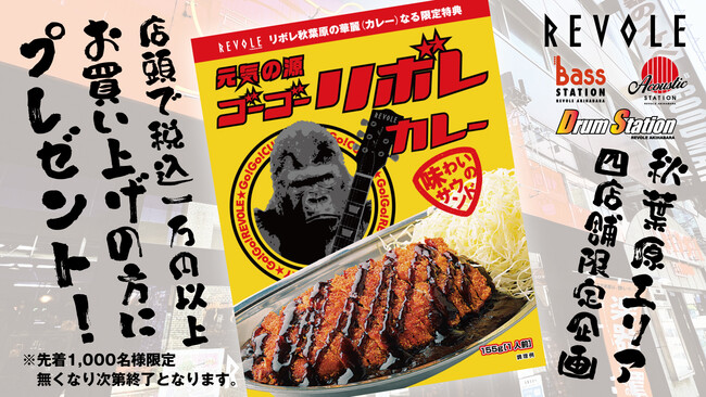株式会社池部楽器店(東京都千代田区 代表取締役社長 田中 義章)が運営する、イケベ楽器店「リボレ秋葉原店」4店舗<リボレ秋葉原、ベースステーション、ドラムステーション、アコースティックステーション>では、11月1日より、店頭で税込10,000円以上お買い上げのお客様先着1,000名様にゴーゴーカレーとのコラボアイテム「ゴーゴーリボレカレー」をプレゼントするキャンペーンを実施します。
