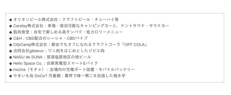 今年はオフサイト開催でより”リアル”な体験を設計すべく、総勢10社にコンテンツパートナーとして参画いただいております。フード・ドリンクを始め、シーシャやサウナ等さまざまなコンテンツを参加者向けにご提供いただきます。