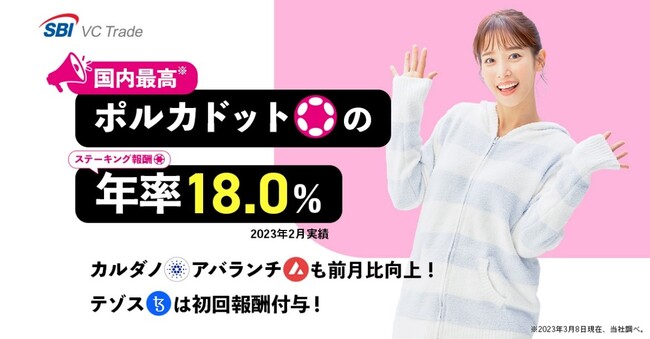 SBI VCトレード株式会社(本社:東京都港区、代表取締役社長:尾崎 文紀、以下「当社」)は、2023年3月15日にポルカドット(DOT)、カルダノ(ADA)、テゾス(XTZ)、アバランチ(AVAX)の2月分のステーキング報酬付与を行う予定です。ポルカドット(DOT)のステーキング報酬は国内最高(※2023年3月8日時点、当社調べ)の年率18.0%と1月の年率13.9%を大きく上回り、カルダノ(ADA)とアバランチ(AVAX)もそれぞれ2.9%、5.8%と1月を超える水準となります。またテゾス(XTZ)は2023年2月のステーキングサービス追加後、初のステーキング報酬付与を年率3.2%で行います。(※数字は当社手数料控除前)