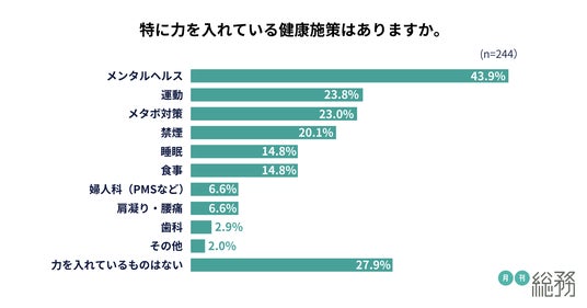 特に力を入れている健康施策について尋ねたところ、「メンタルヘルス」が43.9%で最多となりました。また、27.9%が「力を入れているものはない」と回答しました(n=244)。