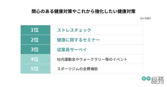 また、関心のある健康対策やこれから強化したい健康対策について尋ねたところ、「ストレスチェック」が最多となりました(n=244)。