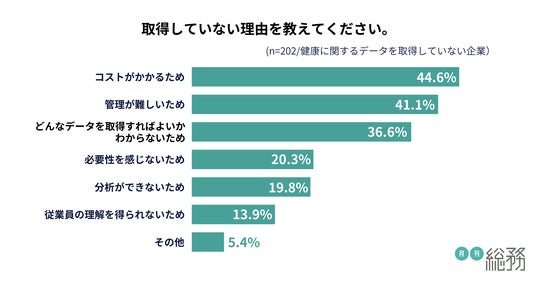 取得していない理由を尋ねたところ、「コストがかかるため」が44.6%で最も多く、「管理が難しいため」が41.1%、「どんなデータを取得すればよいかわからないから」が36.6%と続きました(n=202/健康データを取得していない企業)。