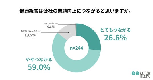 健康経営は会社の業績向上につながると思うか尋ねたところ、85.6%が「つながる」と回答しました(n=244)。
