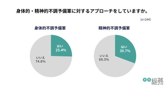 身体的不調予備軍に対するアプローチをしているか尋ねたところ、24.5%が「している」と回答しました。また、精神的不調予備軍に対するアプローチをしているか尋ねたところ、30.7%が「している」と回答しました(n=244)。