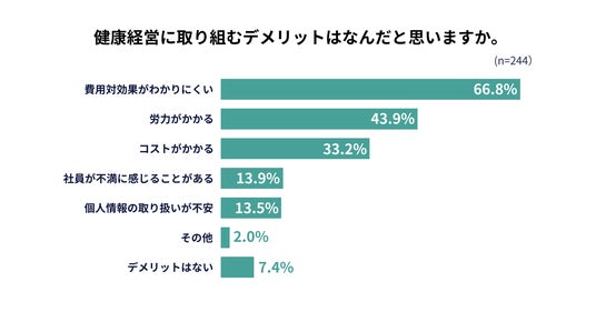 健康経営に取り組むデメリットはなんだと思うか尋ねたところ、「費用対効果がわかりにくい」が66.8%で最多となりました(n=244)。