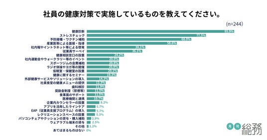 日本で唯一の総務専門誌『月刊総務』を発行する株式会社月刊総務(所在地:東京都千代田区、代表取締役:豊田健一)は、全国の総務担当者を対象に「健康経営についての調査」を実施し、244名から回答を得ました。