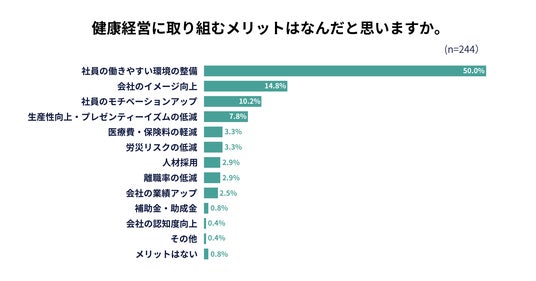 健康経営に取り組むメリットはなんだと思うか尋ねたところ、「社員の働きやすい環境の整備」が50.0%で最多となりました(n=244)。