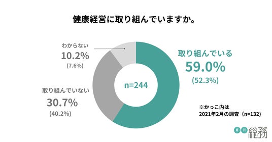 健康経営に取り組んでいるか尋ねたところ、59.0%「取り組んでいる」と回答し、2021年2月の調査より6.7ポイント増加しました(n=244)。