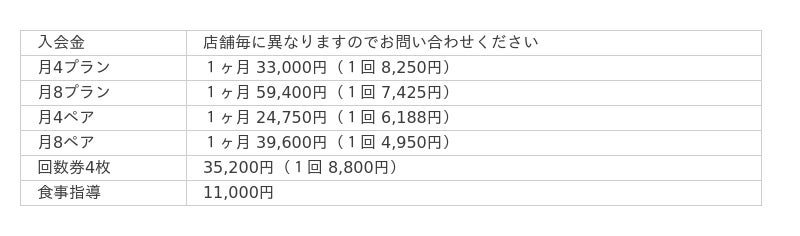 パーソナルジムかたぎり塾のパーソナルトレーニングの料金一覧表(公式配布資料より)