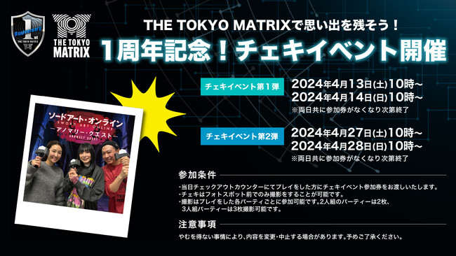 同じく1周年を記念して、4月13日(土)、14日(日)、並びに4月27日(土)、28日(日)の4日間限定で「THE TOKYO MATRIX」にてプレイをした方限定でチェキイベントを開催いたします。施設内のロビーに新たにフォトスポットも設置いたしましたので、1周年の思い出にぜひご参加ください!
