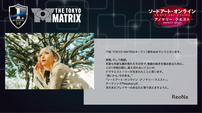 『ソードアート・オンライン-アノマリークエスト-』の主題歌「Weaker」を担当して頂いているReoNaさんから1周年を記念してコメントが到着しました。