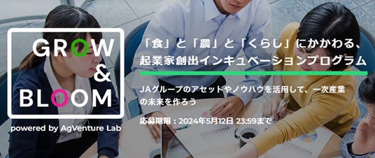 一般社団法人 AgVenture Lab(東京都千代田区/代表理事理事長:荻野浩輝、以下「AgVenture Lab」)は3月25日(月)から、JAインキュベーションプログラム「GROW & BLOOM」(以下「本プログラム」)の募集を開始します。
