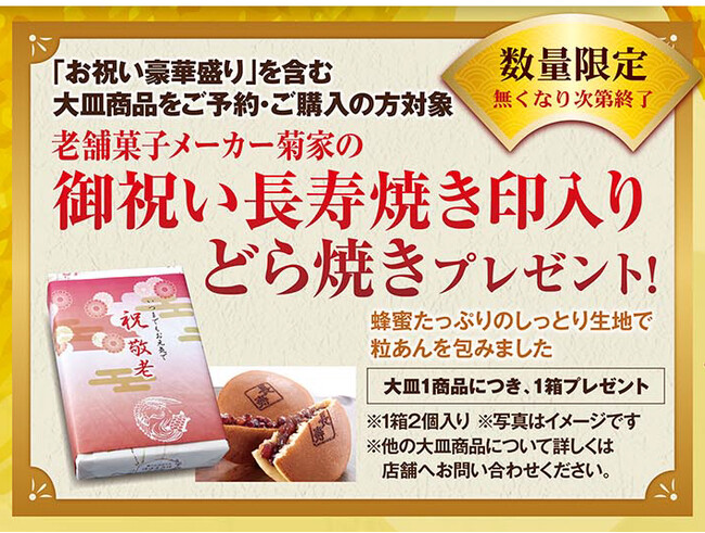 老舗菓子メーカー「菊家」の『御祝い長寿焼き印入り どら焼き』を数量限定でプレゼントいたします!!