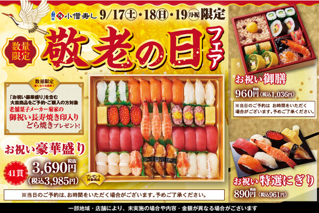 持ち帰り寿し店の「小僧寿し」「茶月」を運営する株式会社小僧寿し(本社:東京都中央区 代表取締役社長 良本 宣之)は、持ち帰り寿し店「小僧寿し」にて、9月17日(土)・18日(日)・19日(祝・月)の期間限定で、「 敬老の日フェア」を開催いたします。