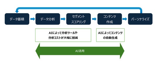 高度なAI技術やデータ分析技術を駆使し、契約情報や購買履歴、支払い方法、Web・アプリでの行動履歴、顧客属性、コンテキストデータなど複合的な情報にもとづき、1人ひとりのユーザーに最適なコンテンツやサービス、製品をリアルタイムで提供する手法です。生成AIの台頭によりデータ分析やコンテンツ生成の自動化も実現が進み、企業のデジタル変革に不可欠な要素となってきています。