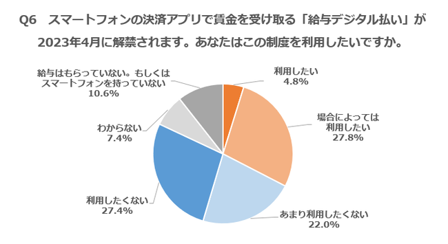 給与デジタル払いを「利用したくない」「あまり利用したくない」は計49.4%で、「利用したい」「場合によっては利用したい」の計32.6%を上回った。(Q6)