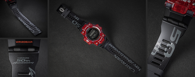 キャラバン誕生50周年を記念して特別に作られた限定モデル「G-SHOCK CARAVAN50th Edition」は、ベルト部分に「キャラバン」のロゴが印字された特別仕様の「G-SHOCK」です。ベースモデルであるGBD-100は「G-SHOCK」の耐衝撃性能や防水性など「タフネス」を兼ね備えつつ、Bluetooth(R)接続によりスマートフォンのGPS機能と連携することでトレーニングログが取れるなど、機能面も充実。