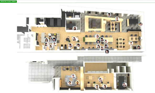 ■特徴2:社員はフリーアドレスを採用し、よりオープンなコミュニケーションを促進。所在はアプリで共有管理する。