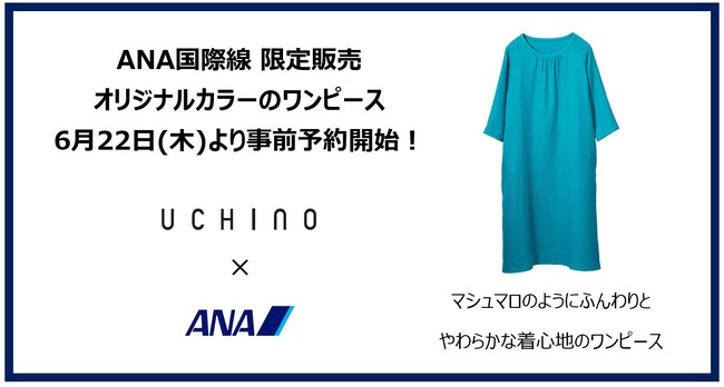 内野株式会社(本社:東京都中央区/代表取締役社長:内野信行)は、ANAとのコラボ商品「肌にやさしいマシュマロガーゼ(R)のワンピース」がリリースされることをお知らせいたします。事前予約でのみご購入いただけるオリジナル商品で、7月1日(土)以降のANA国際線ご搭乗分より販売されます。事前予約は6月22日(木)より開始いたします。(https://www.uchino.co.jp/)