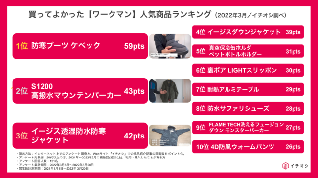 1位の「防寒ブーツケベック」(https://www.ichi-oshi.jp/articles/limited/12249)はFIELD DISCOVERYさんの記事、2位の「高撥水マウンテンパーカー」(https://www.ichi-oshi.jp/articles/limited/13255)はKYOチャンネルさんの記事が大ヒットを記録。2名のイチオシストに、今回のランキング結果の考察や2022年のワークマントレンド予想をお聞きしました。