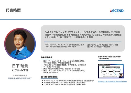 早稲田大学政治学研究科政治学専攻修了。PwCコンサルティング合同会社・株式会社野村総合研究所では物流業界を専門に業務へ従事する。2020年3月、アセンド株式会社を設立。専門領域は物流関連企業の事業戦略立案・実行支援、サプライチェーン・ロジスティクス改革、KGI・KPI実装、人事制度など。「フィジカルインターネットによる物流課題解決」(ヤマト総合研究所、学術論文部門受賞、2020年)などの論文を執筆。JILSの各種委員やTDBCの理事などを務める。