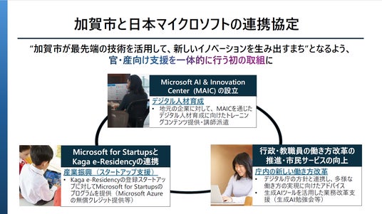2024年11月8日、加賀市(所在地:石川県加賀市、市長:宮元 陸)と日本マイクロソフト株式会社(本社:東京都港区、以下、日本マイクロソフト)は、生成AIやスタートアップ支援に関して、国家戦略特区である加賀市での制度や規制改革を含めて先行モデル導入の取組に関わる連携協定を締結しました。