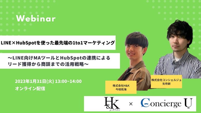企業のマーケティング、DX化などの支援を行う株式会社H&K(本社:神奈川県横浜市、支店:東京都新宿区、代表取締役CEO:安藤弘樹)が、2023年1月31日(火)に、株式会社コンシェルジュ様と共催で「LINE×HubSpotを使った最先端の1to1マーケティング」について語るウェビナーを開催することとなりましたので、ご案内いたします。
