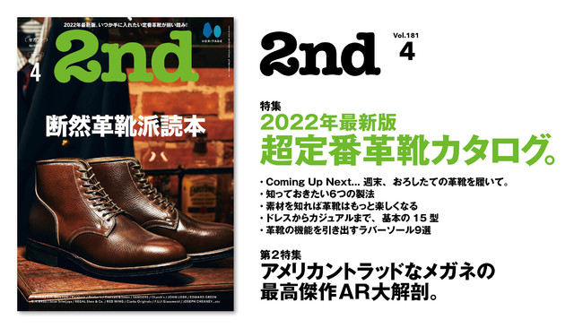 株式会社ヘリテージ(本社:東京都新宿区、代表取締役:齋藤 健一、以下 ヘリテージ)が発行する『2nd(セカンド)』 2022年4月号「断然革靴派読本」特集号が2022年2月16日(水)に発売されます。定番革靴から2022年新作モデルまでをご紹介し、革靴の基礎知識から詳しい歴史までを網羅した2022年版革靴ブランドの教科書とも言える1冊です。第2特集は本誌でも人気の高い"メガネ"を特集。定番メガネから最新人気メガネまで、メガネの歴史を紹介する年表などと共にご紹介いたします。