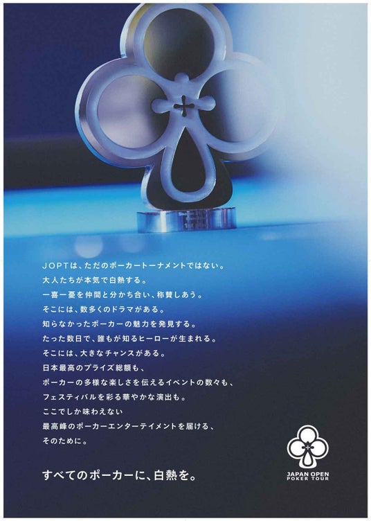 「すべてのポーカーに、白熱を。」というタグラインを掲げ、日本でのポーカーの普及とアジア No.1を目指す大会作りに取り組んでいます。