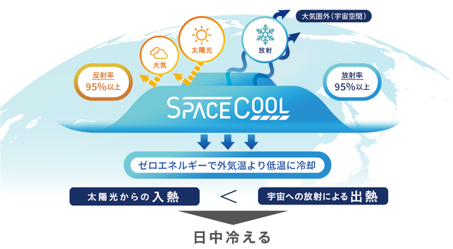 *1:独自の放射冷却技術を用い、太陽光の入熱を抑え、熱放射による出熱(熱せられた物体の熱が電磁波・光として運ばれる現象)を大きくした材料設計により実現