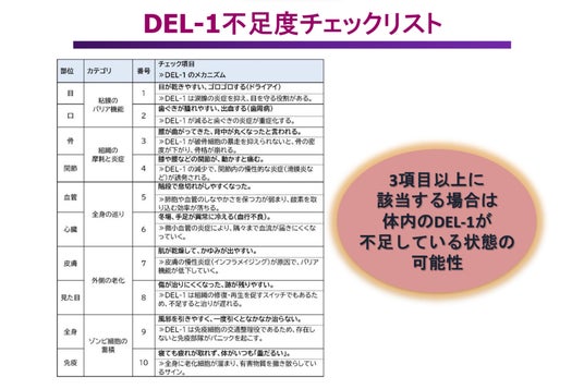 また、セミナーでは「DEL-1不足度チェックリスト」も紹介されました。3項目以上当てはまる場合、体内のDEL-1が不足している可能性があります。具体的には、目の乾きや歯ぐきの腫れ、肌の乾燥などが挙げられます。
