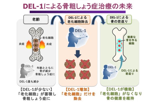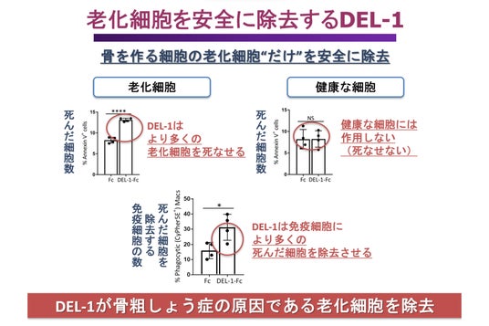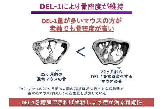 今回の講演で特に注目されたのが、本年1月に発表された骨粗しょう症の根本治療につながる論文の解説です。現在の骨粗しょう症の治療には、「骨の破壊を抑える」「しかし骨は作られない」「副作用が大きい」という課題があり、その課題の解決のために、骨粗しょう症の原因である老化細胞を安全に除去する方法が求められていました。そこで、DEL-1が多いマウスと少ないマウスを比較すると、DEL-1が老化細胞“だけ”を安全に除去しており、その結果、DEL-1量が多いマウスの方が骨密度が高くなりました。これは、DEL-1を増加させることで、骨粗しょう症を根本的に治すことができる可能性を示唆しています。骨粗しょう症を根本的に治療し、骨を若返らせることができる未来がすぐそこまで来ており、そのカギはDEL-1が握っているのです。