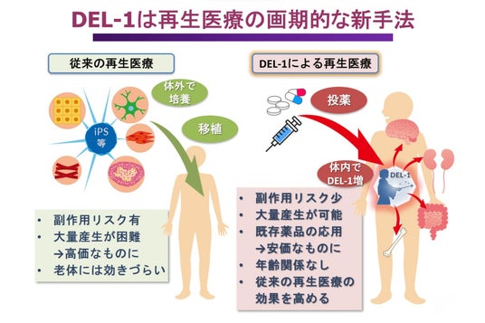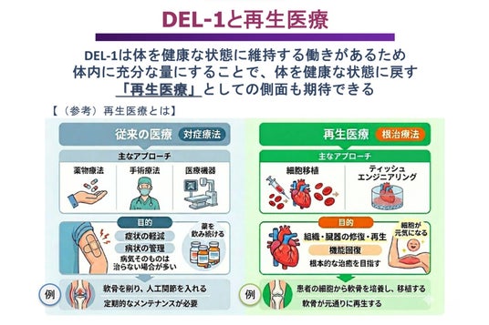 DEL-1は体を健康な状態に維持する働きがあるため体内に十分な量にすることで、体を健康な状態に戻す「再生医療」としての側面も期待できます。これまでの再生医療は、iPS細胞などを体外で培養して移植する方法が主流でしたが、副作用リスクやコストの高さ、高齢者には効果が出にくいといった課題がありました。これに対し、DEL-1を活用したアプローチは、体内でDEL-1を増やすことにより、老化細胞を取り除き、組織の修復や機能回復を促進することで、体を健康な状態に戻していきます。この方法は、既存の薬の応用が可能であることや、DEL-1を大量に産生できる点から、より現実的で広く活用できる再生医療として注目されています。