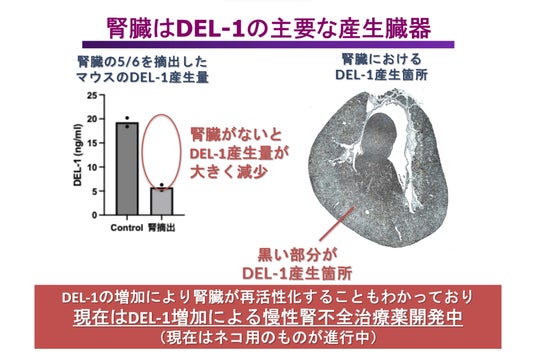 DEL-1は腎臓で多く作られていることがわかっており、DEL-1が腎臓の機能維持に重要な役割を果たしている可能性が示唆されています。実際にDEL-1の増加により腎臓が再活性化することが明らかになっており、現在、DEL-1増加による慢性腎不全の治療薬の開発が行われています。“不治の臓器“として知られる腎臓が“治せる臓器”になる未来も夢ではなくなっています。