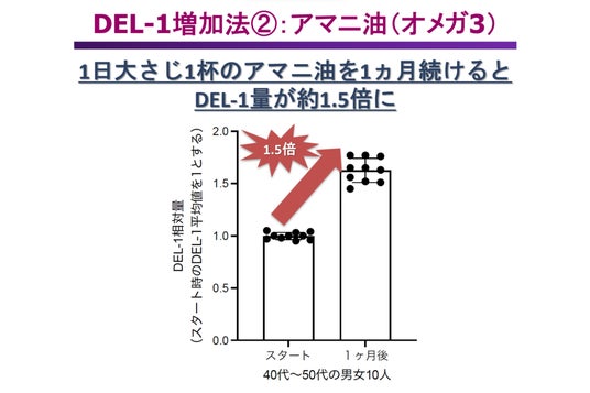 オメガ3を含む「アマニ油」を摂取することでもDEL-1を増やすことができます。研究では、1日大さじ1杯の摂取でウォーキングと同様にDEL-1量が約1.5倍に増加しました。アマニ油は熱に弱いため、炒め物ではなく味噌汁や納豆など、日常的に食べるものにかけて取り入れるのがおすすめです。特にたんぱく質と一緒に摂ることで吸収効率も高まります。