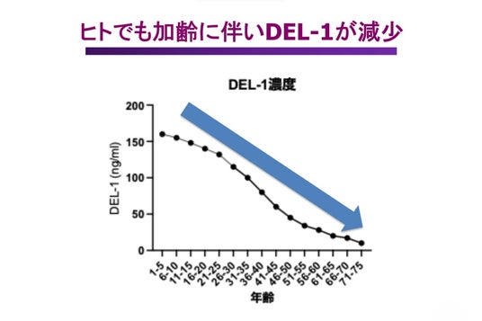 DEL-1と骨破壊の関係性を発見し、骨がもろくなりやすい老齢マウスがDEL-1量が低いことに注目し、DEL-1が”老化抑制のカギ”である可能性を見出しました。そしてそれはヒトにも同様であることがわかり、以後、DEL-1と老化の相関関係および老化に伴い生じる様々な疾患との関係性を調査・研究しています。