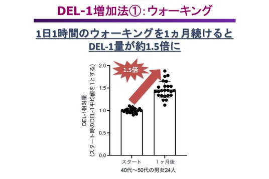 DEL-1を増やす方法の1つは「ウォーキング」です。研究では、1日1時間のウォーキングを1ヵ月続けると、DEL-1量が約1.5倍に増加しました。