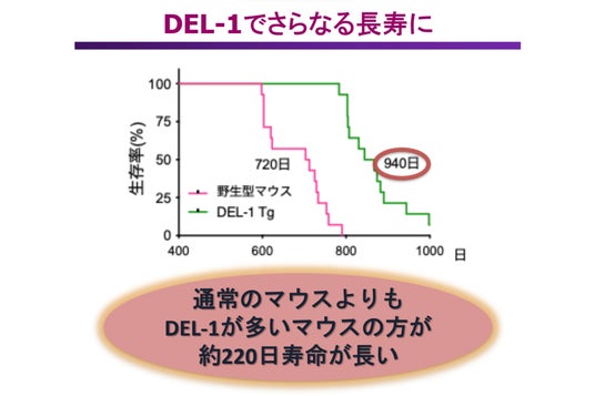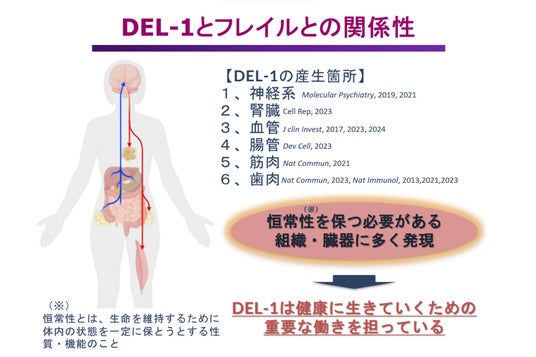 高齢社会において課題となっている「フレイル」。これは、健康と要介護の中間状態ですが、DEL-1の減少がその引き金になる可能性が示されています。しかし、十分な量のDEL-1を体内で産生し、臓器を正常に保つことでフレイルになることを防げる可能性があり、DEL-1がフレイルを防ぐカギになるのではないかと注目されています。さらに、通常のマウスよりもDEL-1が多いマウスの方が約220日寿命が長いという結果が出ていることから、DEL-1を増やすことが寿命の延伸につながる可能性もあり、DEL-1の今後から目が離せません。