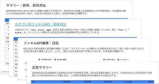 『Ubun BASE』の「スライドレポート」は、セラーセントラル/ベンダーセントラルの売上データから、Amazonスポンサー広告のパフォーマンス、Amazon Marketing Cloud(AMC)のリテンションレポート(※2)まで、事業全体の数値を自動で集約し一つのレポートにまとめ上げます。さらに、当社のAmazonマーケティングのノウハウが詰まった示唆に富んだ40ページ超の報告書を、“ボタン一つ”でGoogleスライド形式で生成します。誰もが見やすく、チームでの分析や共有がスムーズに行える画期的な機能として、すでに多くのユーザーにご活用いただいています。
