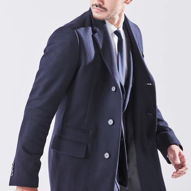 表面にはあえてフェイクのチェンジポケットを設けて、シンプルなチェスターコートにアクセントを加えています。
