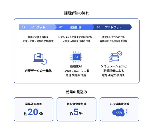 今回のOptium導入により、業務効率が約20%改善するとともに、約5%の燃料消費量削減が見込まれています。また、配船の最適化によるCO2排出量の低減も期待されており、環境負荷の低減にもつながる取り組みです。