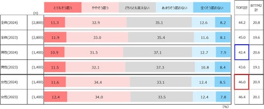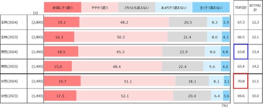 幸福度(「非常にそう思う」+「ややそう思う」の計)は67.3%で、前回調査の66.5%より0.8pt上昇しました。男女別では、女性(70.8%)が男性(63.8%)を7.0pt上回っており、前回調査同様、女性の幸福度が男性よりも高い結果となりました。