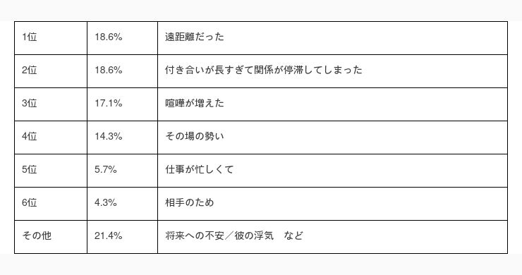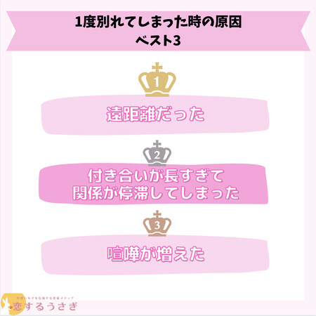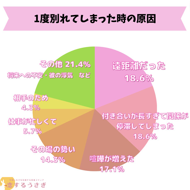 恋するうさぎ編集部が行った『1度別れてしまった時の原因』のアンケートによると1位:遠距離だったが18.6%、付き合いが長すぎて関係が停滞してしまったが18.6%、喧嘩が増えたが17.1%という結果になりました。
