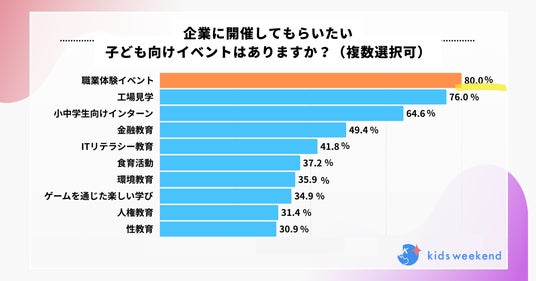 「職業体験イベント」(80.0%)や「小中学生向けインターン」(64.6%)が特に人気を集め、企業によるキャリア教育プログラムへの期待が高まっています。特に、実際の仕事を体験することは、子どもたちの将来の職業選択に大きく役立つと考えられています。