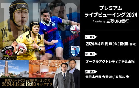 2024年4月19日(金) 秩父宮ラグビー場で開催される、NTT ジャパンラグビーリーグワン 2023-24 第14節 東京サントリーサンゴリアス戦(19:00キックオフ)を、静岡県浜松市オークラアクトシティホテル浜松にて「プレミアム ライブビューイング 2024 Presented by 三菱UFJ銀行」開催する事が決定しましたのでお知らせします。