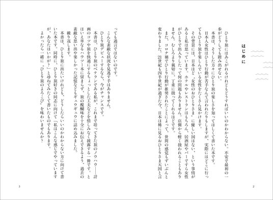 本書は、ひとり旅のベテランである私が、これまで培ってきた旅のノウハウ――計画のコツや旅を快適にするちょっとした工夫などを惜しみなく披露する一冊です。とはいえ単なるハウツー本に留まらず、旅の醍醐味を十全にお伝えできるよう、過去の素敵な思い出や楽しかった記憶などもギュウギュウに詰め込みました。