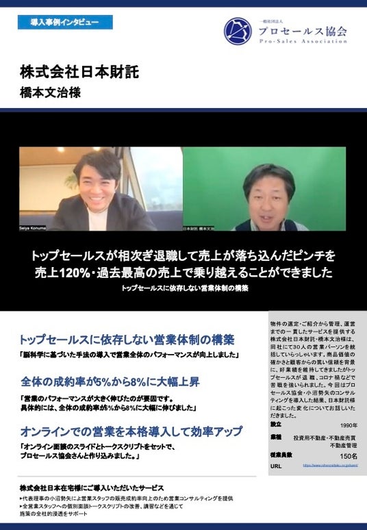 物件選定・ご紹介から管理、運営まで一貫したサービスを提供する株式会社日本財託・橋本文治様、同社にて30人の営業パーソンを統括していらっしゃいます。商品価値の確かさと顧客からの篤い信頼を背景に、好業績を維持してきましたが、トップセールスが退職、コロナ禍などで苦戦を強いられました。今回、プロセールス協会・小沼勢矢のコンサルティングを導入した結果、日本在宅様に起こった変化についてお話しいただきました。