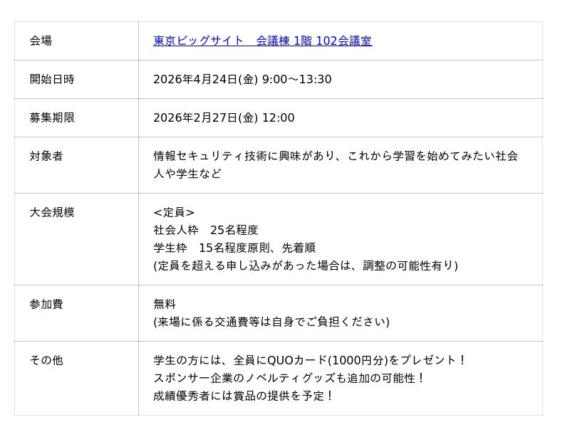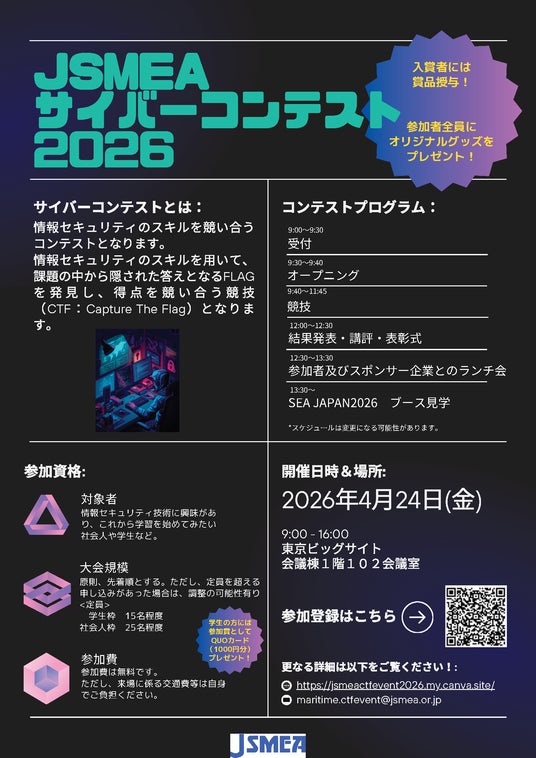 2026年4月24日(金)に「JSMEAサイバーコンテスト2026」(株式会社VLCセキュリティラボ受託)が開催されますことをご案内いたします。