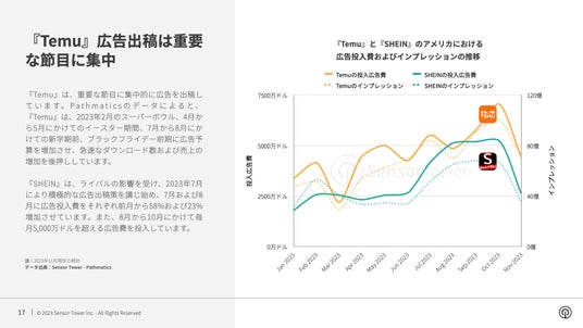 Sensor Towerデジタル広告分析プラットフォームPathmaticsのデータによると、2023年1月から11月までに『Temu』がアメリカで投じた広告費は5.1億ドルに達し、前年同期と比べて17倍増加しています。『Temu』は、スーパーボウル、秋の新学期前、ブラックフライデーなどのマーケティングの重要な節目に広告費を増加させており、トラフィックの増加が『Temu』の急速なアメリカ市場開拓を支えています。
