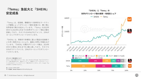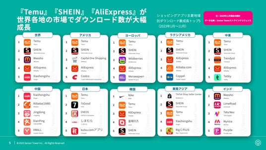 2023年、『Temu』および『SHEIN』のダウンロード数が急成長し、アメリカ、ヨーロッパ、ラテンアメリカ、中東のショッピングアプリ成長ランキングでトップをうかがい、『Amazon』や『Shopee』を抜いて世界で最も人気のショッピングアプリとなっています。